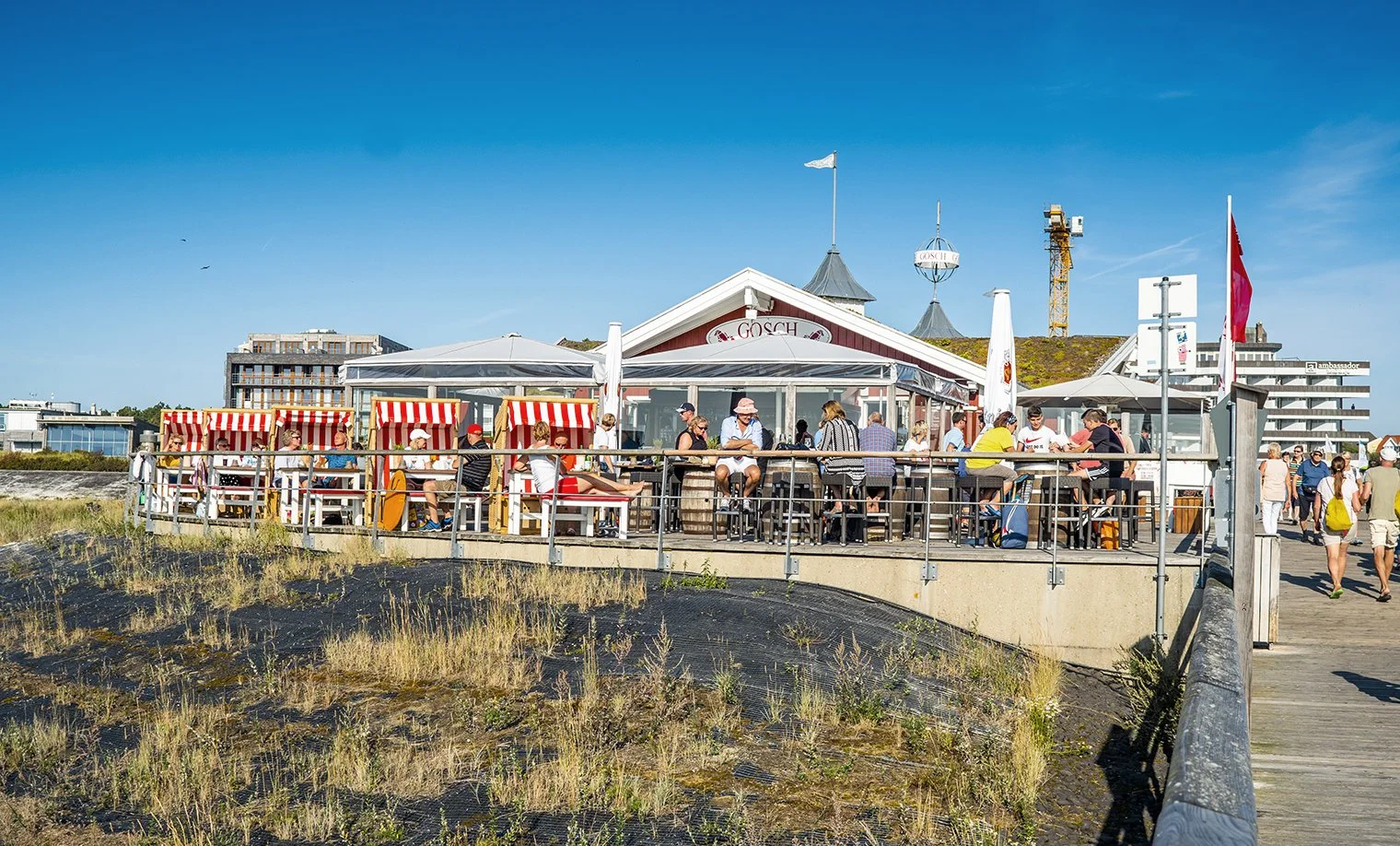 “Gosch”. Sehen und gesehen werden direkt an der Seebrücke von St. Peter Bad. Fisch-Spezialitäten, gute Stimmung und ein guter Ausblick sind garantiert.